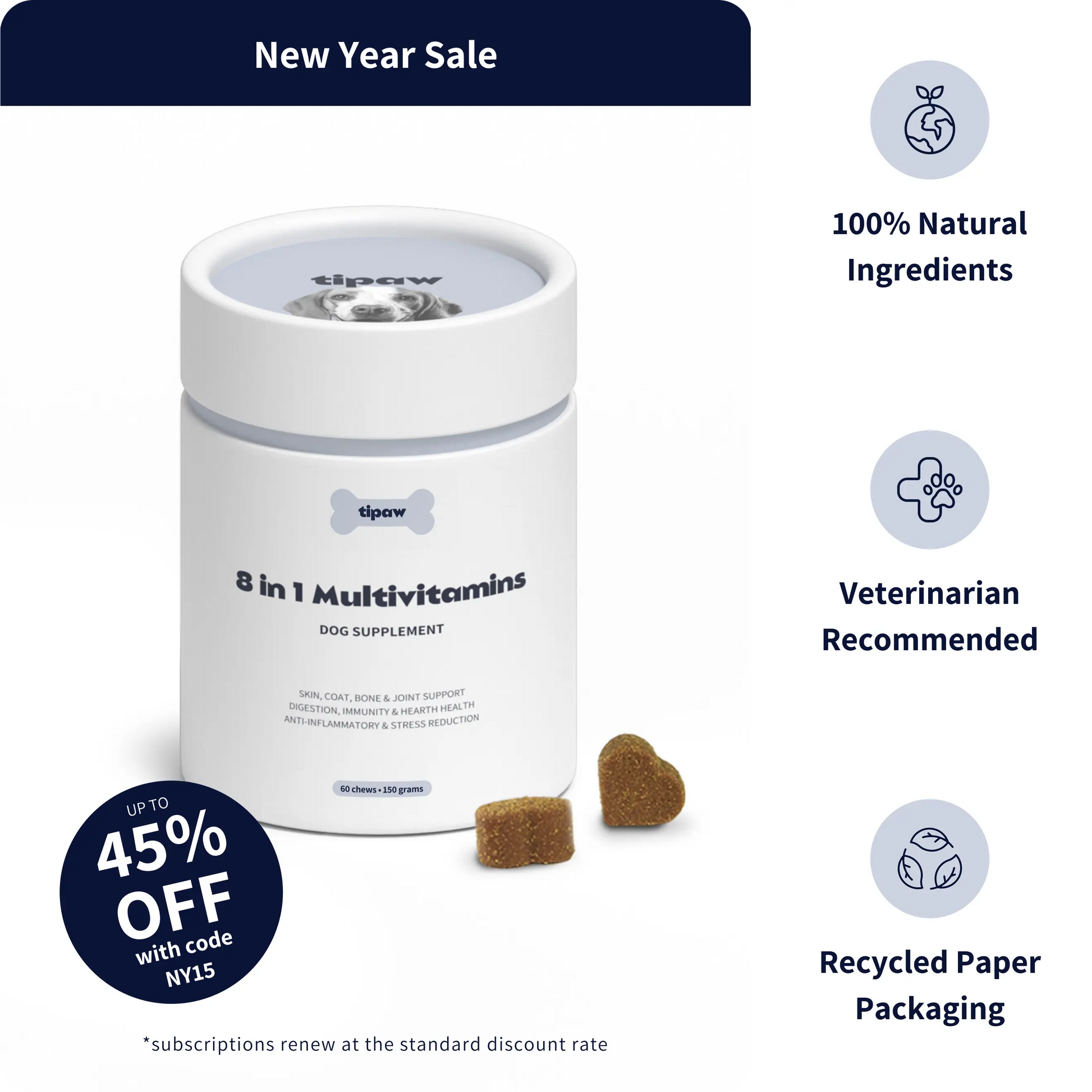 I have a big dog, so it’s really important to me that she gets the best supplements possible. What I really liked about the 8 in 1 Multivitamins is that it’s packed with everything she needs — and the dosage is perfect for larger dogs. Just 3 pieces a day is enough, which is great, because each piece is concentrated and you don’t need to give 5 or 6 like with some other brands. The texture is nice, my dog absolutely loved the taste, and the ingredients are great too. Overall, very happy with this product - especially for owners of large dogs!🤩